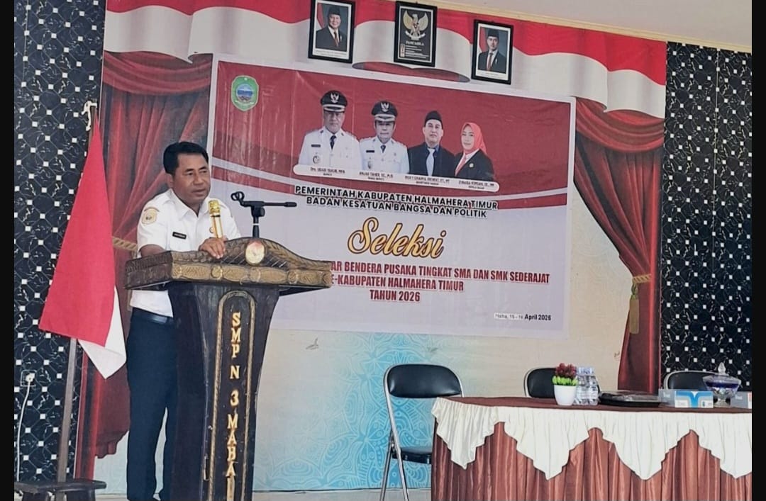 HALTIM, kabartimur.com – Bupati Halmahera Timur, Ubaid Yakub, MPA, resmi membuka seleksi Pasukan Pengibar Bendera Pusaka (Paskibraka) tingkat kabupaten tahun 2026. Kegiatan tersebut berlangsung di Aula SMP Negeri 3 Haltim, Rabu (15/04/2026).