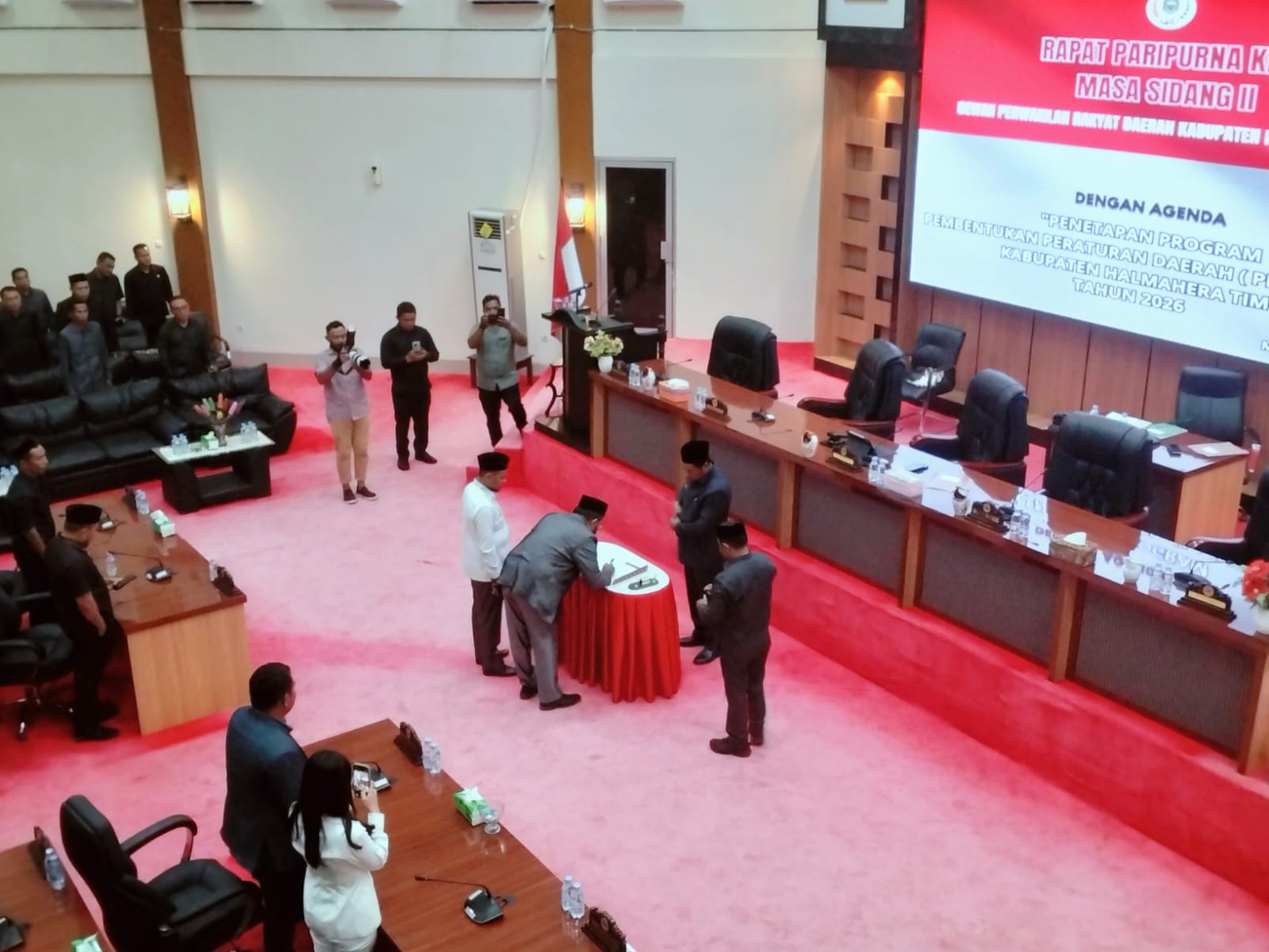 Rapat yang digelar di ruang paripurna DPRD Haltim itu mengagendakan penetapan Program Pembentukan Peraturan Daerah (Propemperda) Tahun 2026. Kegiatan ini dihadiri Bupati Halmahera Timur Ubaid Yakub, Ketua DPRD Idrus E. Maneke, Wakil Ketua II Abdul Latif Mole, serta pimpinan Organisasi Perangkat Daerah (OPD).