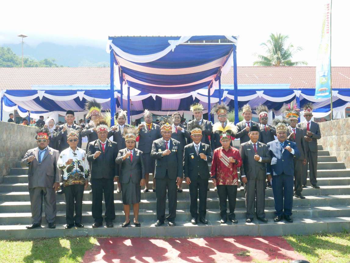 Turut Asisten I Setda Provinsi Papua Barat Syors Ortisans Marini, Ketua DPRK Teluk Wondama Aplena Dimara bersama unsur pimpinan dan anggota juga para tokoh pejuang pemekaran Teluk Wondama. (Nday)