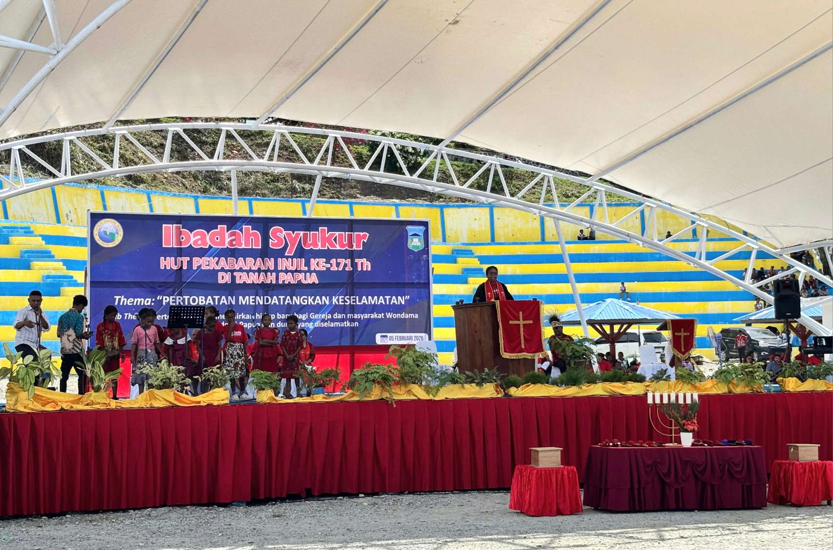 Ibadah syukur HUT PI di Tanah Papua ke-171 tahun di kota Wasior dihadiri ribuan umat Kristen dari berbagai denominasi gereja. Ibadah dipimpin Pendeta Maya T dan pelayan firman Pendeta Sherly Parinussa.