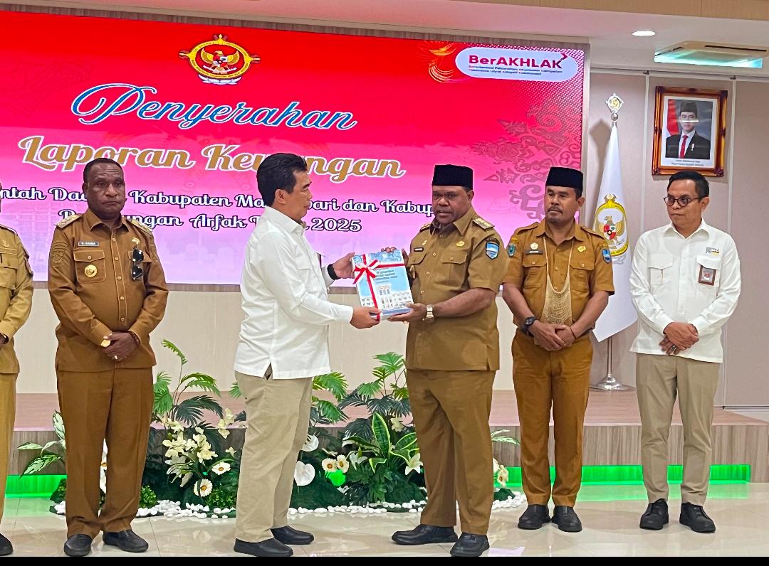 MANOKWARI, kabartimur.com – Pemerintah Kabupaten Manokwari dan Kabupaten Pegunungan Arfak (Pegaf) menyerahkan laporan keuangan pemerintah daerah (LKPD) Tahun Anggaran 2025 kepada Badan Pemeriksa Keuangan (BPK) RI Perwakilan Papua Barat, Selasa (21/4/2026).
