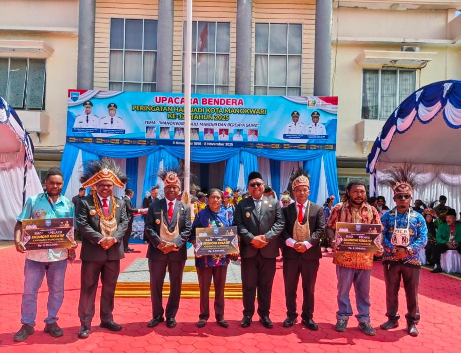 MANOKWARI, kabartimur.com – Pemerintah Kabupaten Manokwari melalui Dinas Pariwisata, Ekonomi Kreatif, dan Kebudayaan menyalurkan bantuan pembinaan kepada 20 pelaku usaha ekonomi kreatif, bertepatan dengan peringatan HUT ke-127 Kota Manokwari, Sabtu (8/11/2025).