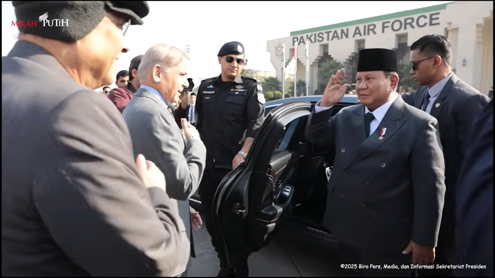 Setibanya di Nur Khan Base Airport, Presiden Prabowo disambut langsung oleh Presiden Pakistan Asif Ali Zardari dan PM Shehbaz Sharif, sementara dari pihak Indonesia terlihat Duta Besar RI untuk Pakistan Chandra Warsenanto dan Atase Pertahanan RI Kolonel Inf. Henru Hidayat Susanto. Upacara kehormatan dengan jajar pasukan, dentuman 21 kali _Gun Salute_, dan rangkaian bunga dari seorang anak kecil Pakistan menambah hangatnya sambutan untuk Presiden Republik Indonesia.