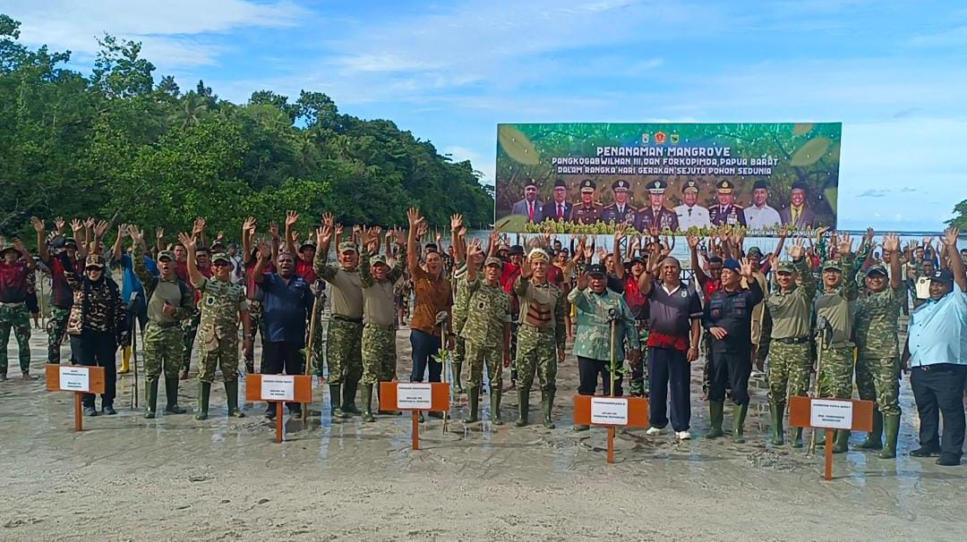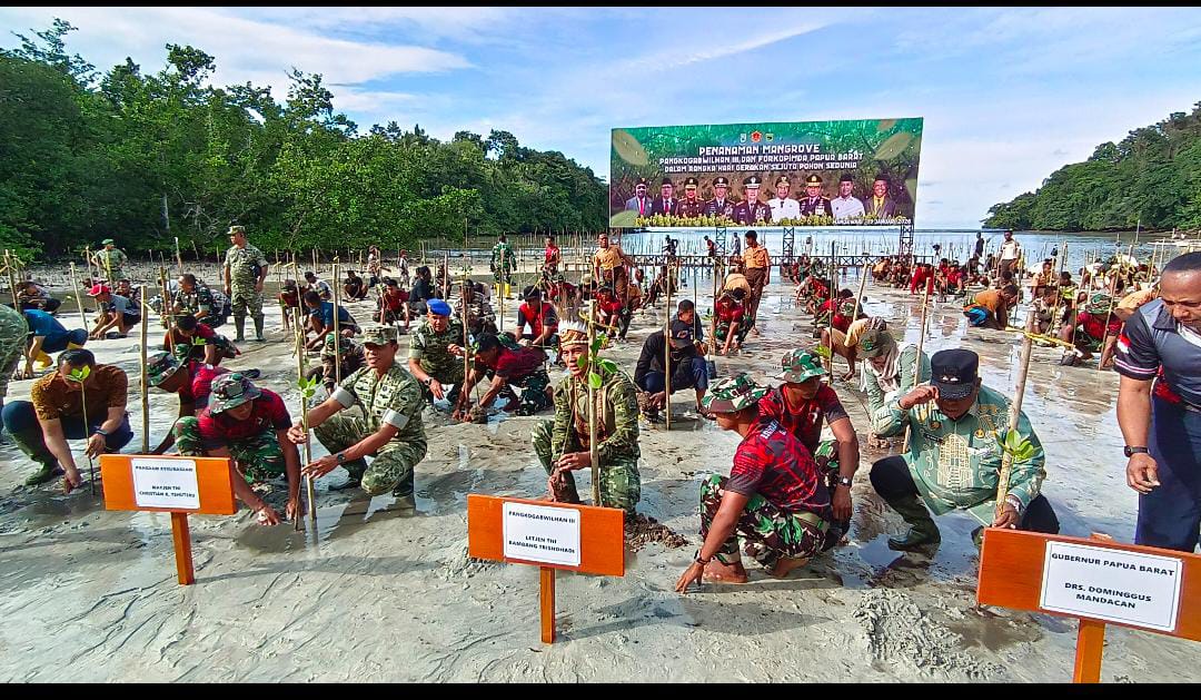 Manokwari, kabartimur.com – Dalam rangka memperingati Hari Gerakan Sejuta Pohon Sedunia, Panglima Komando Gabungan Wilayah Pertahanan (Pangkogabwilhan) III bersama Forum Koordinasi Pimpinan Daerah (Forkopimda) Papua Barat melaksanakan kegiatan penanaman mangrove di Pantai Saubeba, Distrik Manokwari Utara, Kabupaten Manokwari, Papua Barat, Jumat (9/1/2026).