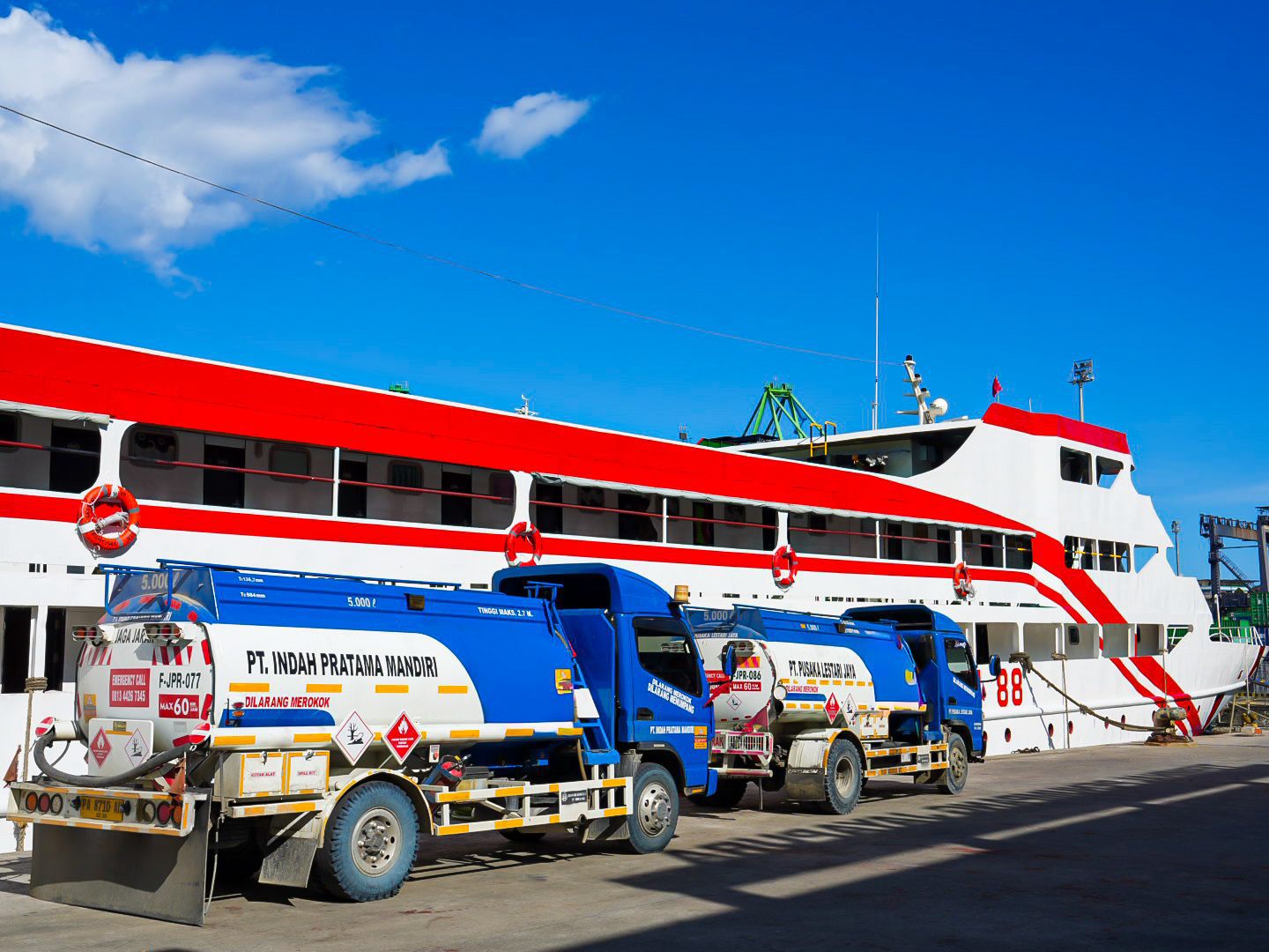 “Ini merupakan pengisian pertama dalam rangka mendukung kebutuhan BBM Kapal Cantika Lestari 77 dan Cantika Lestari 88. Selanjutnya, rencananya akan dilakukan pengisian kembali pada 22 dan 24 Desember dengan perkiraan kebutuhan sekitar 35 ribu liter. Secara keseluruhan, total BBM yang disuplai mencapai kurang lebih 65 ribu liter untuk mendukung kelancaran mudik gratis melalui jalur laut,” ujar Awan.